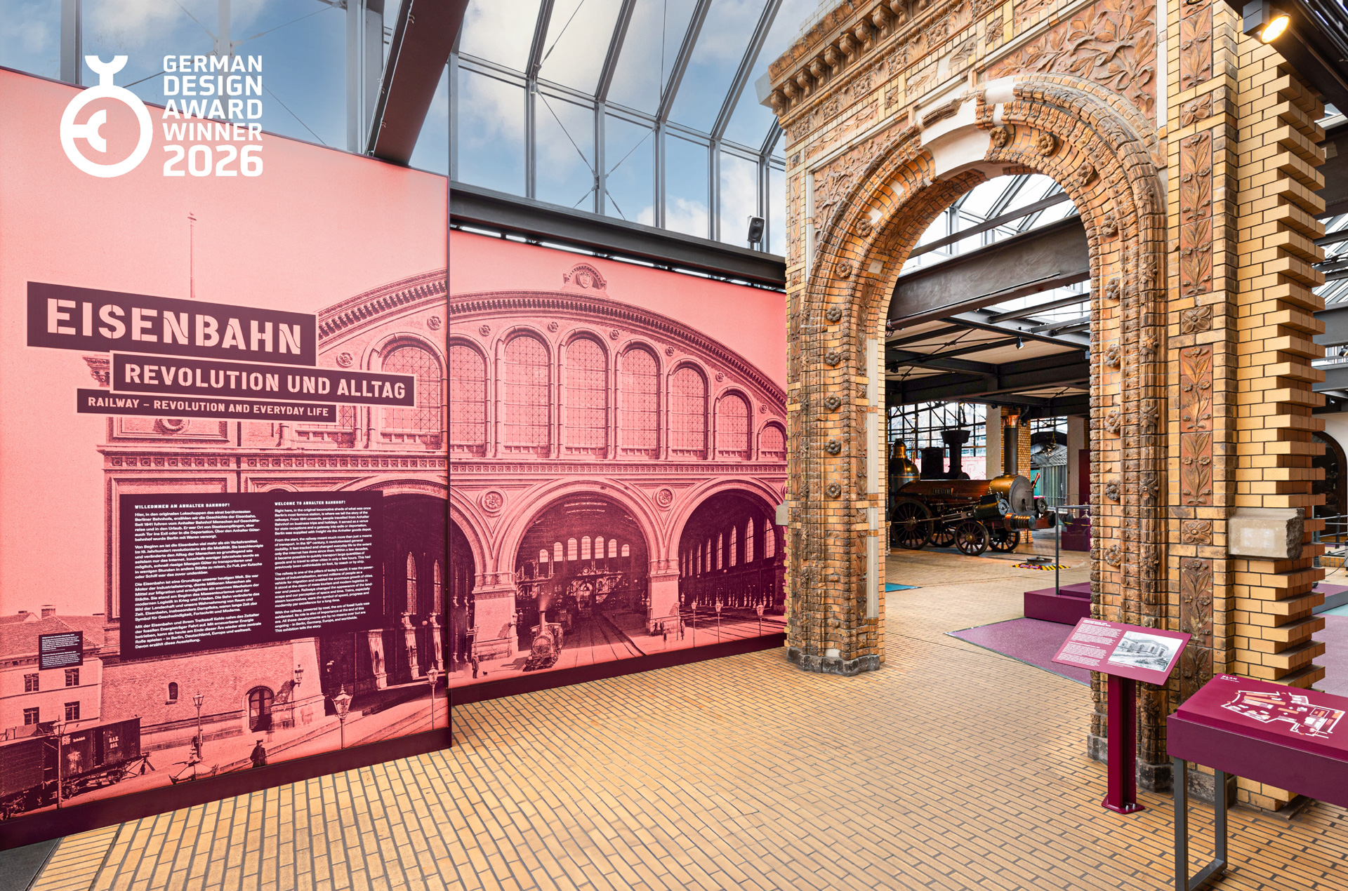 Die neue Dauerausstellung des Technik Museum Berlin macht es deutlich: Technikgeschichte ist zugleich menschliche Alltagsgeschichte. Der Schienenverkehr veränderte das Leben aller Menschen für immer grundlegend. So hat die Eisenbahn beispielsweise große Migrationsbewegungen ermöglicht und die Zeitzonen geschaffen. In den historischen Lokschuppen gliedern farbige Ausstellungsinseln den Rundgang. Medieninstallationen und Mitmach-Stationen laden zum Entdecken ein, die Geschichte zentraler Objekte wird in Zeichentrickfilmen vermittelt. Großformatbilder strukturieren den Ausstellungsraum und leiten die Besuchenden. Exponatinseln grenzen sich klar von der Bestandsarchitektur ab und stellen jeweils einen Themen- oder Technikbereich konzentriert und verdichtet vor. Alle Flächen der Exponatinseln sind ebenerdig und damit barrierefrei zugänglich. Mediale Bespielungen erwecken die Großexponate zum Leben und eröffnen eine Welt, in der die Imagination der Besuchenden angeregt wird. Auf 1.700 Quadratmetern wird die Zeit von den Anfängen der Eisenbahn vor 200 Jahren bis 1914 dargestellt.